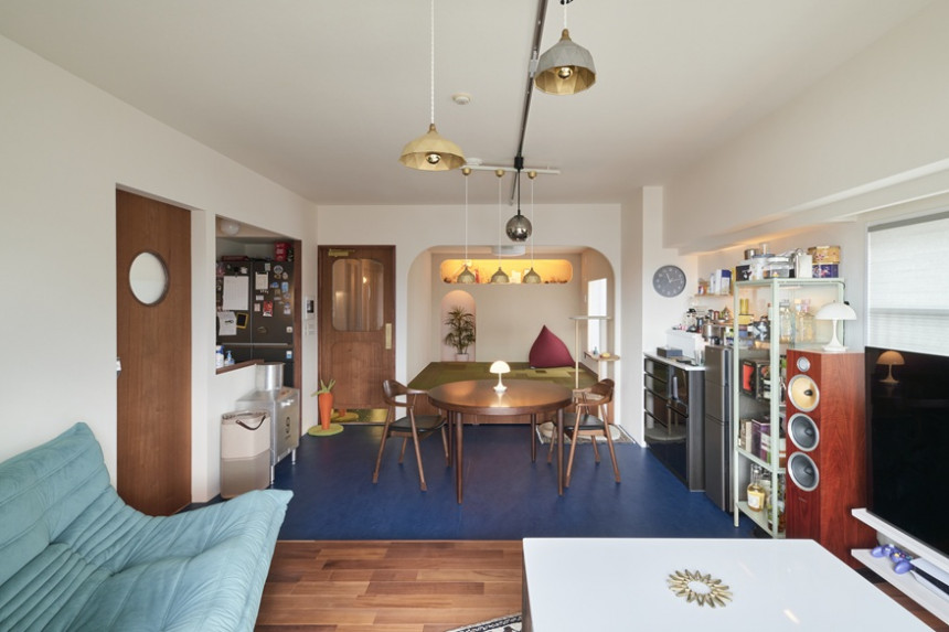 元々の間取りは少し変わっていて、動かせない浴室が真ん中にドーンとあり、LDが少し広すぎます。そこで、浴室横にあった独立型キッチンをLDへと大移動。高い位置から外の景色やリビングが見渡せるステージキッチンの誕生です。「このマンションは風通しがいいから、抜けるようにしたらいいですね」とのアドバイスから、1本目は玄関→廊下→LDK、2本目は玄関→WIC→洗面室→キッチンと、ズドーンと風が抜ける2つの動線を確保しました。「浴室を中心にくるくる回れるこのプラン、生活に合っているなあと、しっくりきます。キッチンからの見晴らしが良くて、本当に気持ちがいい。料理得意ではなかったけれど、今は料理が楽しいです」とKさん。そうそう、「再婚本気!」もリノベ前に実現し、現在夫は単身赴任中。「私は子どもとの時間が大切。彼も自分の時間が大切。だから、この家にいる時は4人一緒にいることを楽しんでいます」。次は、どんな夢が叶うのかな。