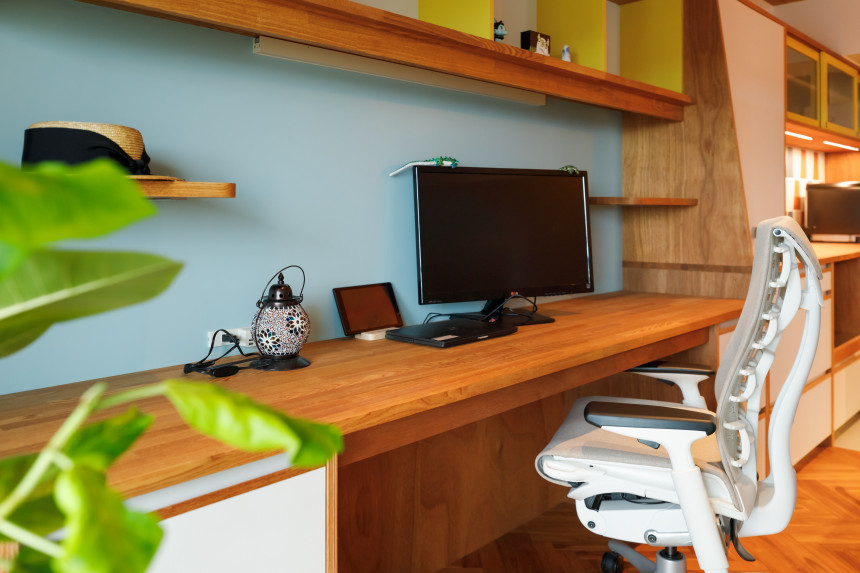 造作収納と床材の切り替え、それに付随する天井のレールで斜めの線を描く。すると視線が対角線に抜け、室内がより広く感じられる。書斎に程よい陰影をつくるのは、日当たりの良い窓に背を向けるよう斜めに配したワードローブ。圧迫感を抑えた高さでありながら、日光の影響を受けずにイラストレーター業に専念できる空間だ。2つの造作収納と窓辺の造作天井はキャットウォークも兼ね、愛猫への工夫も忘れない。