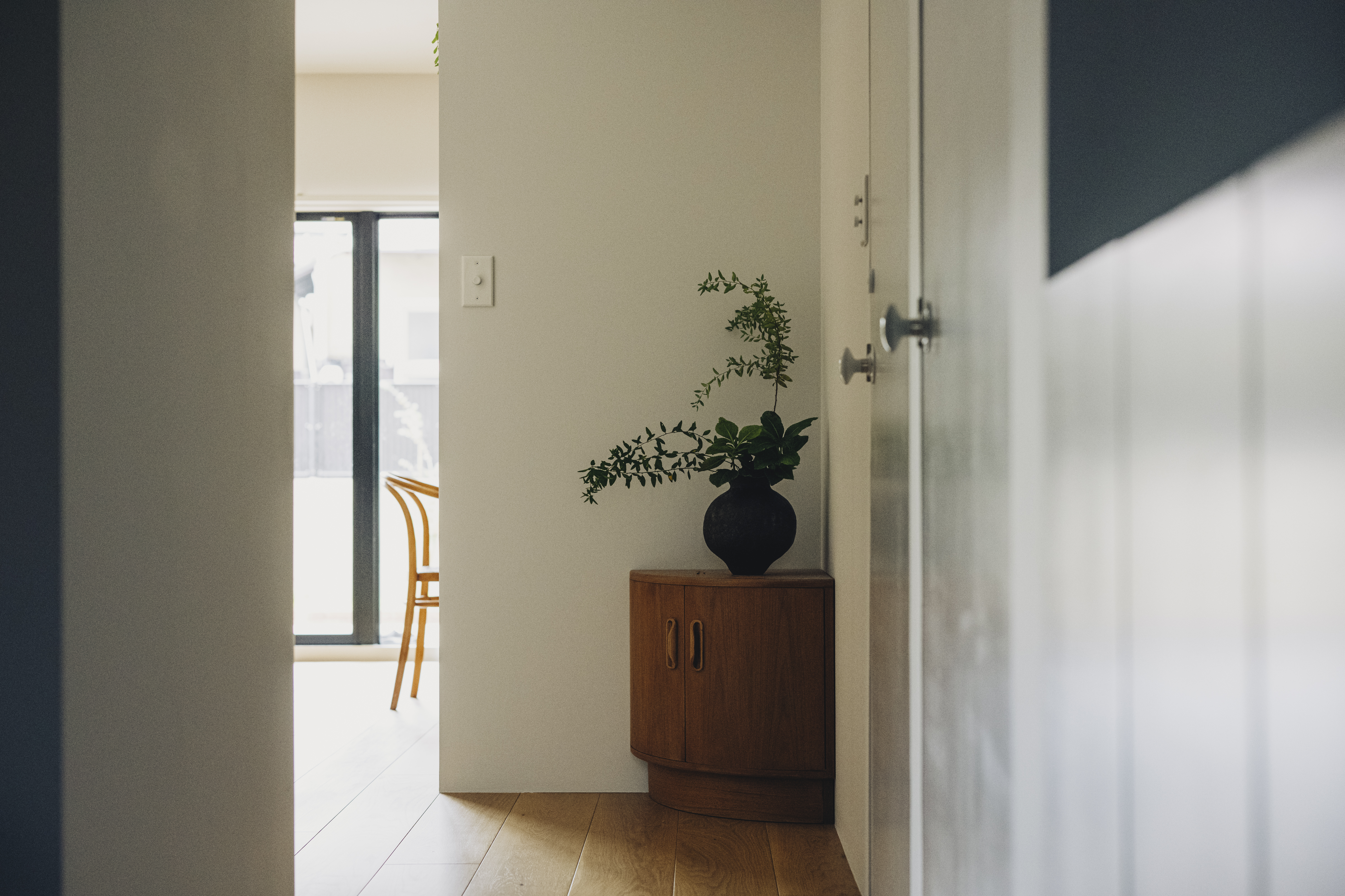 玄関からまっすぐに進むと現れるゆるやかなアールの壁。