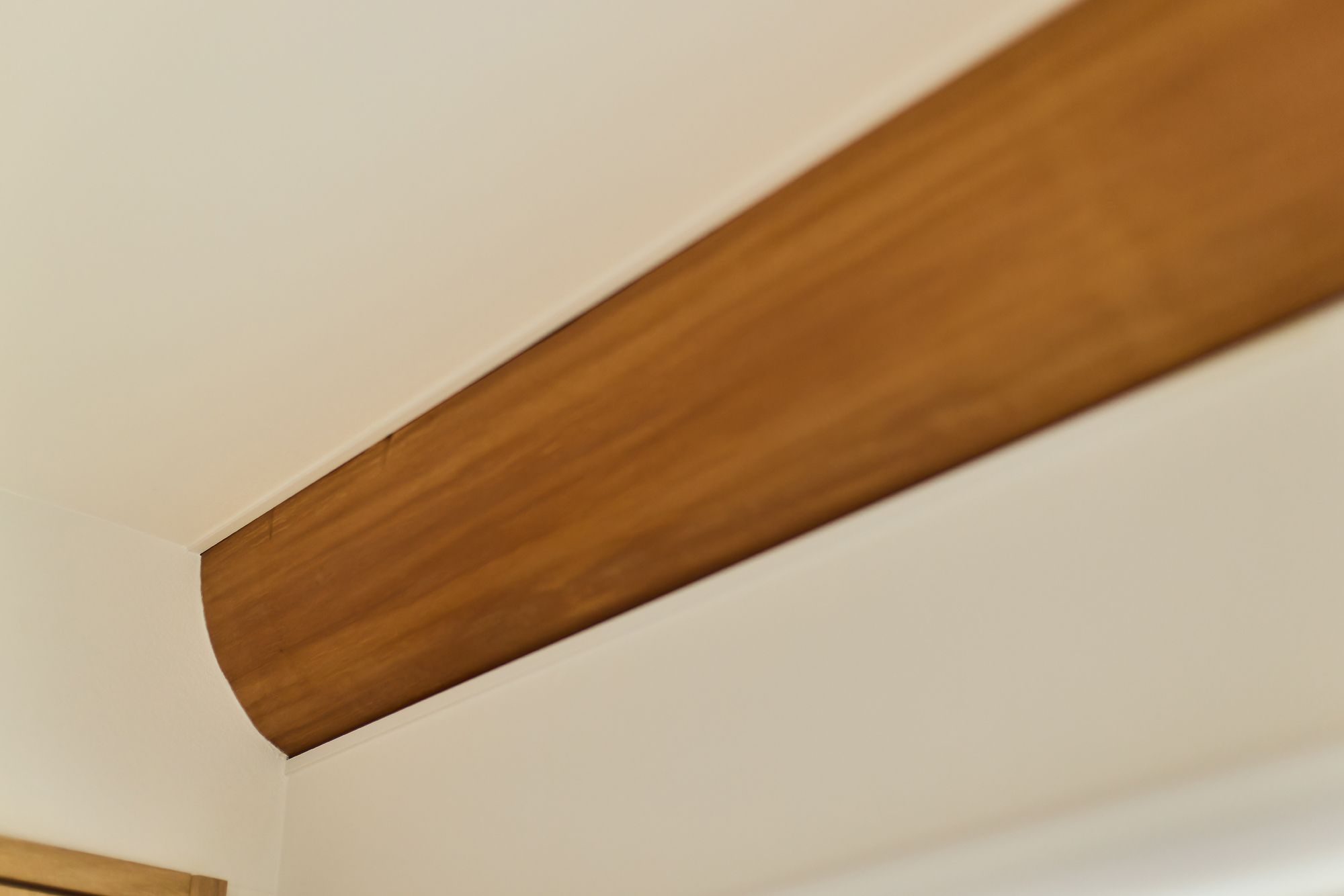 築50年を迎えた東広島市の離れは、外観上は階高が高く見えるものの、実際は平屋建てで、丸太梁の上部に大きな小屋裏空間を備えながらも、点検口や固定階段はなく、長らく未利用のままでした。内部は真壁構造に土壁が用いられ、断熱性能は不十分で、床下も当時の仕様のまま湿気や劣化の影響を受けやすい環境でした。母屋と廊下で接続されているため、水まわりは母屋に依存しており、離れ単独での生活機能は限定的。今回の改修では、この小屋裏の懐を活かし、和室の天井を抜いてロフトを設けるなど、既存の弱点を住まいの新たな価値へと転換する計画としました。
