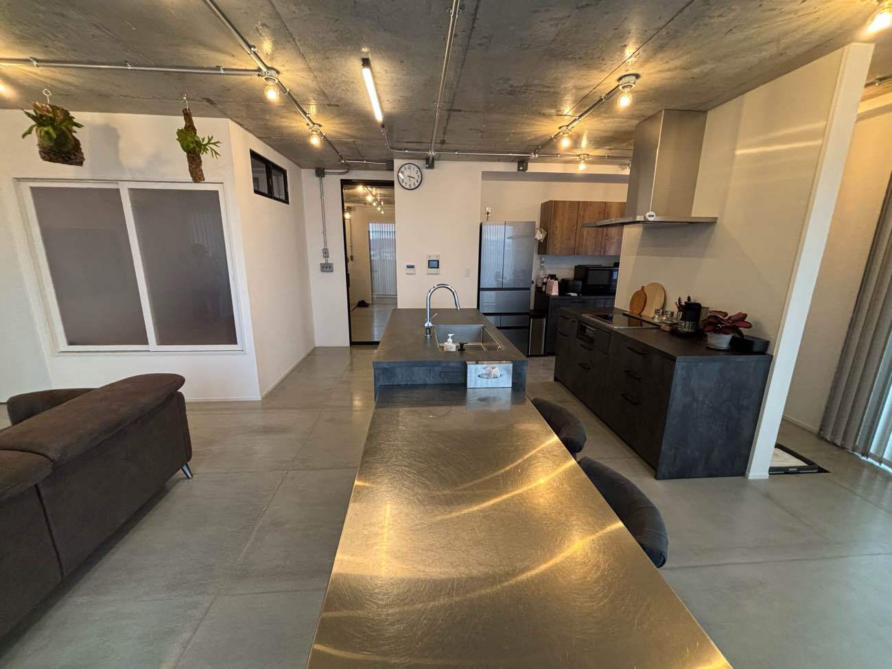 GRAFTEKTキッチンを中心に据え、現し天井や金属配管、トグルスイッチなど素材感のあるディテールが、空間全体のクールで洗練された雰囲気を引き立てています。
