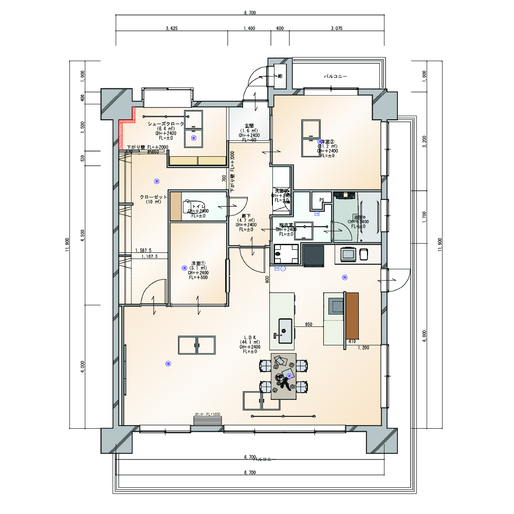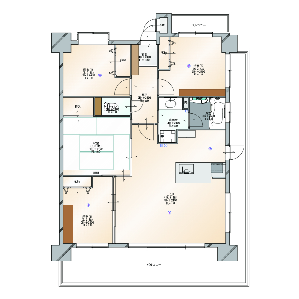 洋室2部屋と、LDKに隣接する洋室・和室を備えた4LDKのファミリー向けマンション。玄関の天井まであるシューズクロークや各所の床下収納など、収納力は十分ですが、浴室・洗面脱衣所は同じ空間にまとまっており、日常の動線や家事のしやすさにはやや制約があります。部屋数も多く、ファミリークローゼットなど家族の希望を叶えるには少し工夫が必要な間取りでした。