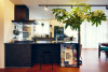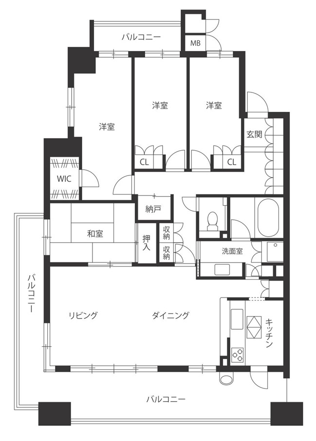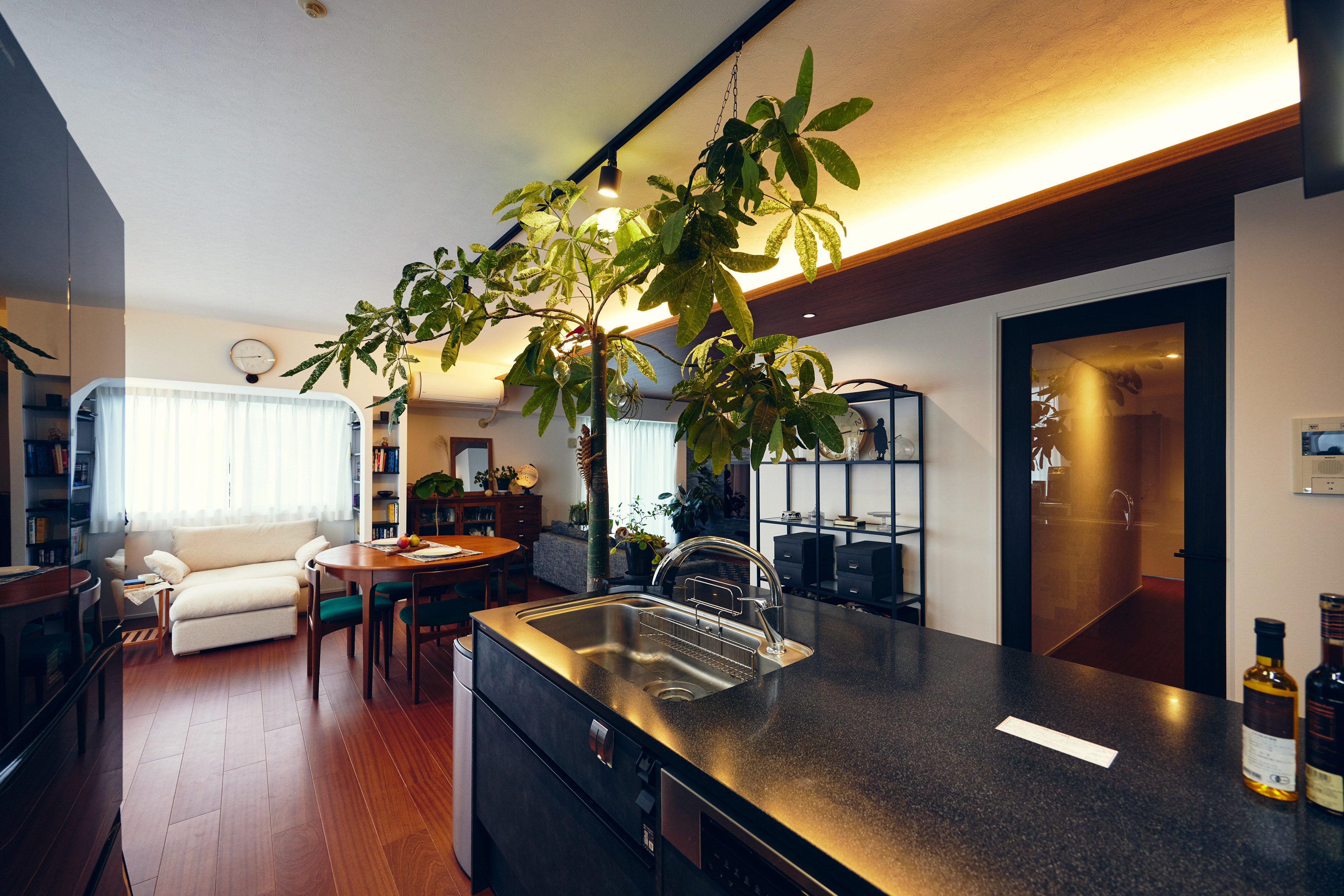 家族が自然とリビングに集まるような空間にしたいご要望から、リビングの拡張だけでなく、本が好きなお子様達用にヌックスペースを配置。広くなったリビングでもキッチンに立ってご家族の気配を感じれる配置に。各個室を最低限の広さに抑え家全体の間取りの最適化を行うことで、ランドリールームも新たに設けることができた。家族5人分の洋服を一ヶ所に集約するウォークインクローゼットは家の中心に設けた。リビング・廊下・洋室どの部屋からのアクセスも便利な動線に配慮。一番下のお子様の一人部屋が必要となる時には、カーテンや壁で部屋を間仕切っても出入りができるよう、ウォークインクローゼットの出入り口を活用し、将来的な間取り変更も容易にできるように設計。家族の趣味であるキャンプ道具は玄関近くに大容量の納戸を配置することで、土を家の中に上げることなく帰宅後の片付けもスムーズに。カラーテイストは大好きなグリーンとお手持ちの家具にマッチしたヴィラリゾート風。リビングの大型ミラーとの相性のよいカラーでまとめた。グリーンも随所に感じられるよう、天井からの吊り下げ位置も入念に打合せ。窓回りは重たいイメージにはしたくないご要望からレースカーテンのみとし、自然光と風を感じられるグリーンに囲まれた癒しの空間を作り上げることができた。念願のリノベーションでご家族それぞれの時間を同じリビングで過ごせるようになった。