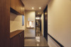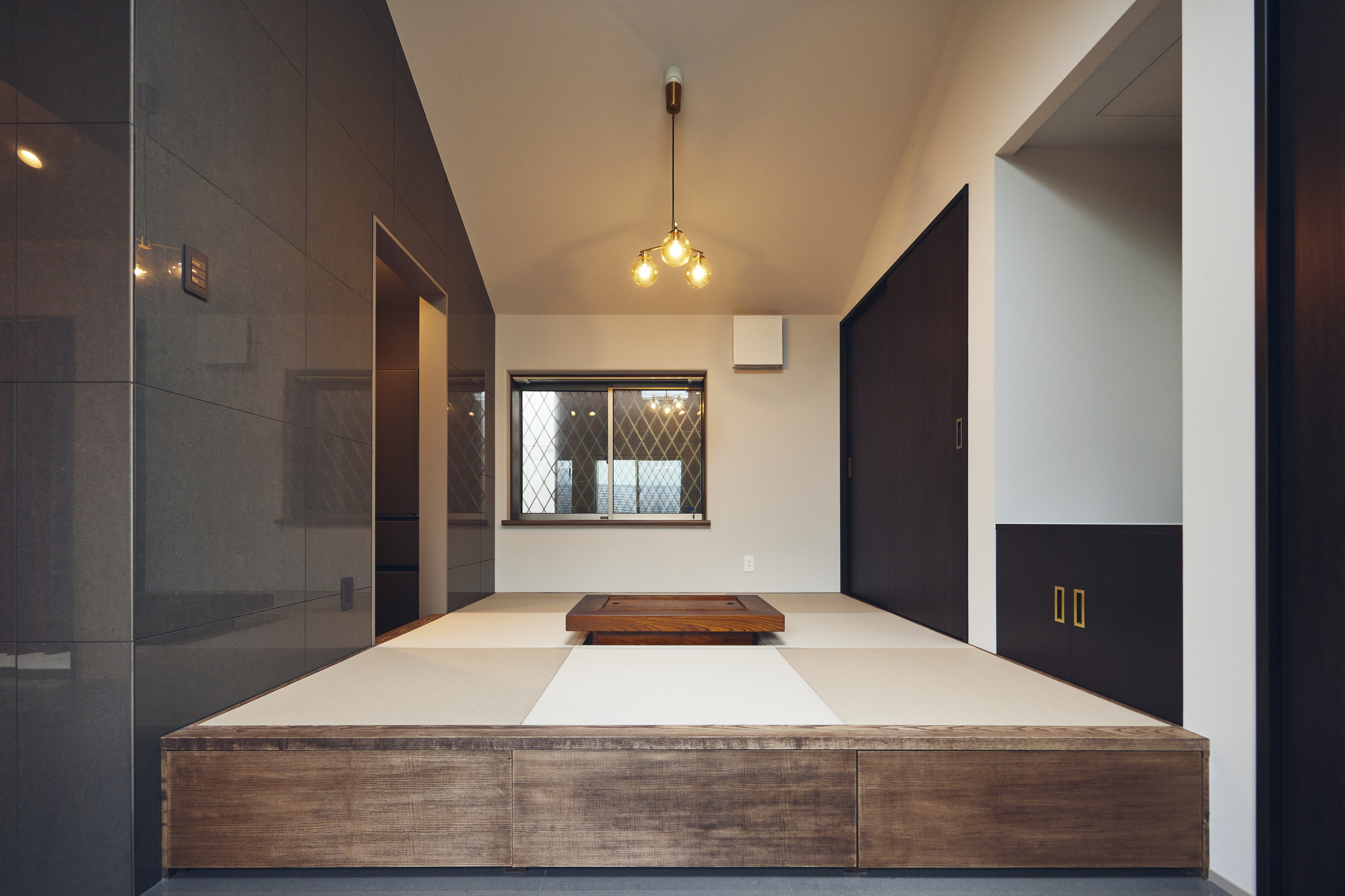 寝室はオンとオフを意識し、LDKの世界観との調和するよう天井に木格子を貼り、デザインを施しつつも安らげる空間を意識した。さらに、和のテイストもお好きな施主様がお持ちだった囲炉裏を活かせる小上がりを設置。下部に引き出し収納を設け、収納面と日本らしさ、座れる空間作りの両立を狙った。
