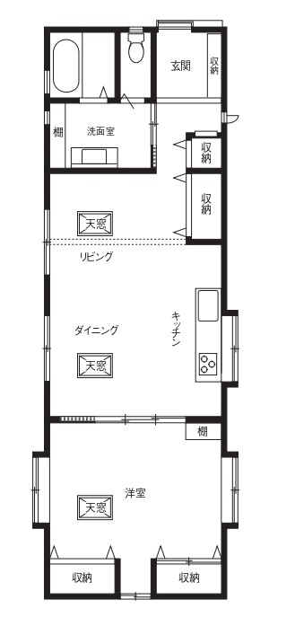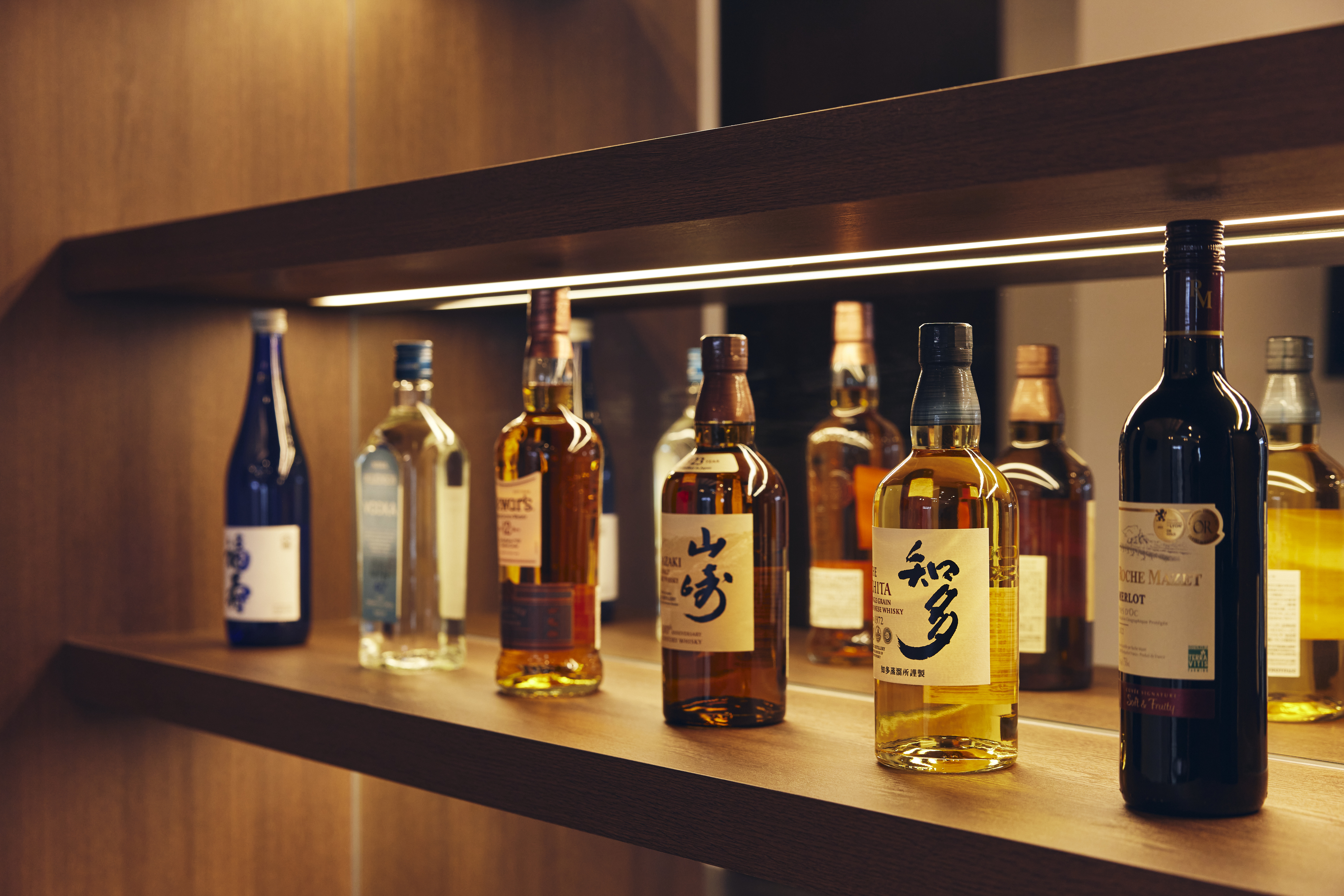 最大の見どころは、施主様のこだわりでもある本格的なバーカウンター。店舗の内装のような非日常感を演出するため、カウンターには重厚な質感のある素材を選定。ボトルが並ぶ背面の棚、高級感あふれる下がり天井、それらを引き立てる照明計画まで細かく設計した。音楽を楽しみながらお酒を愉しめるよう、天井にはスピーカー付きのダウンライトを採用。平屋構造で高めの天井高と相まって、空間全体に心地よい音が広がり、ヴィンテージワインの味をより一層引き立てることに。