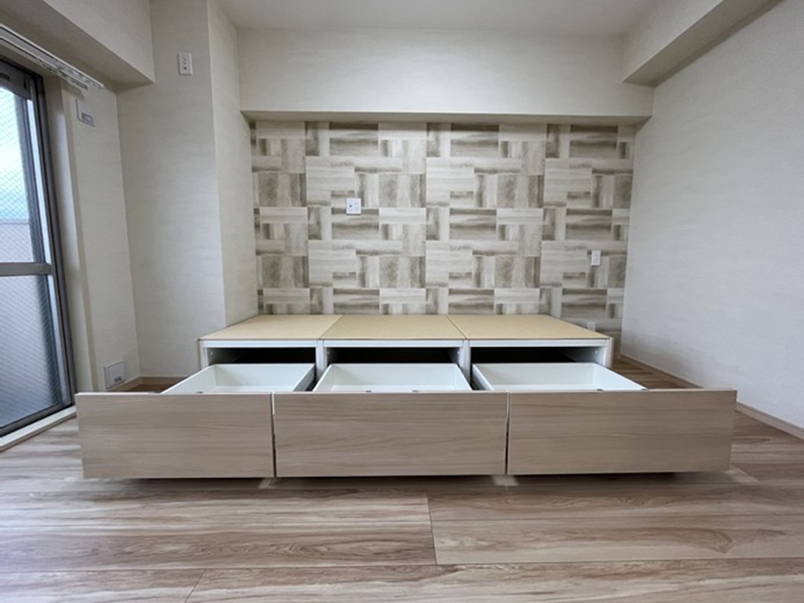 また、和の雰囲気は残したいとのご要望を叶えるために、可動式の畳の小上がり収納を設置。お部屋ごとに段差があったため、床をすべて作り直して、段差のないバリアフリー化を実現しました。
