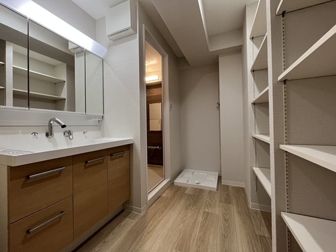 洗面室は面積を少し広げた上で、扉のないオープン収納をご提案して、使いやすさを追求。家事のしやすい空間に生まれ変わりました。