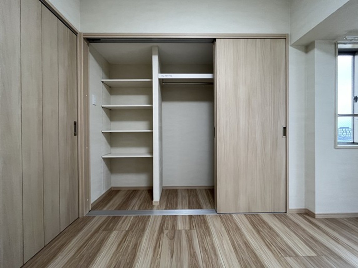 リビングの隣の和室を洋間化してリビングと一体化し、もともと和室の押入だった部分は主寝室のクローゼットに作り替え、お洋服が片付けやすい収納に。