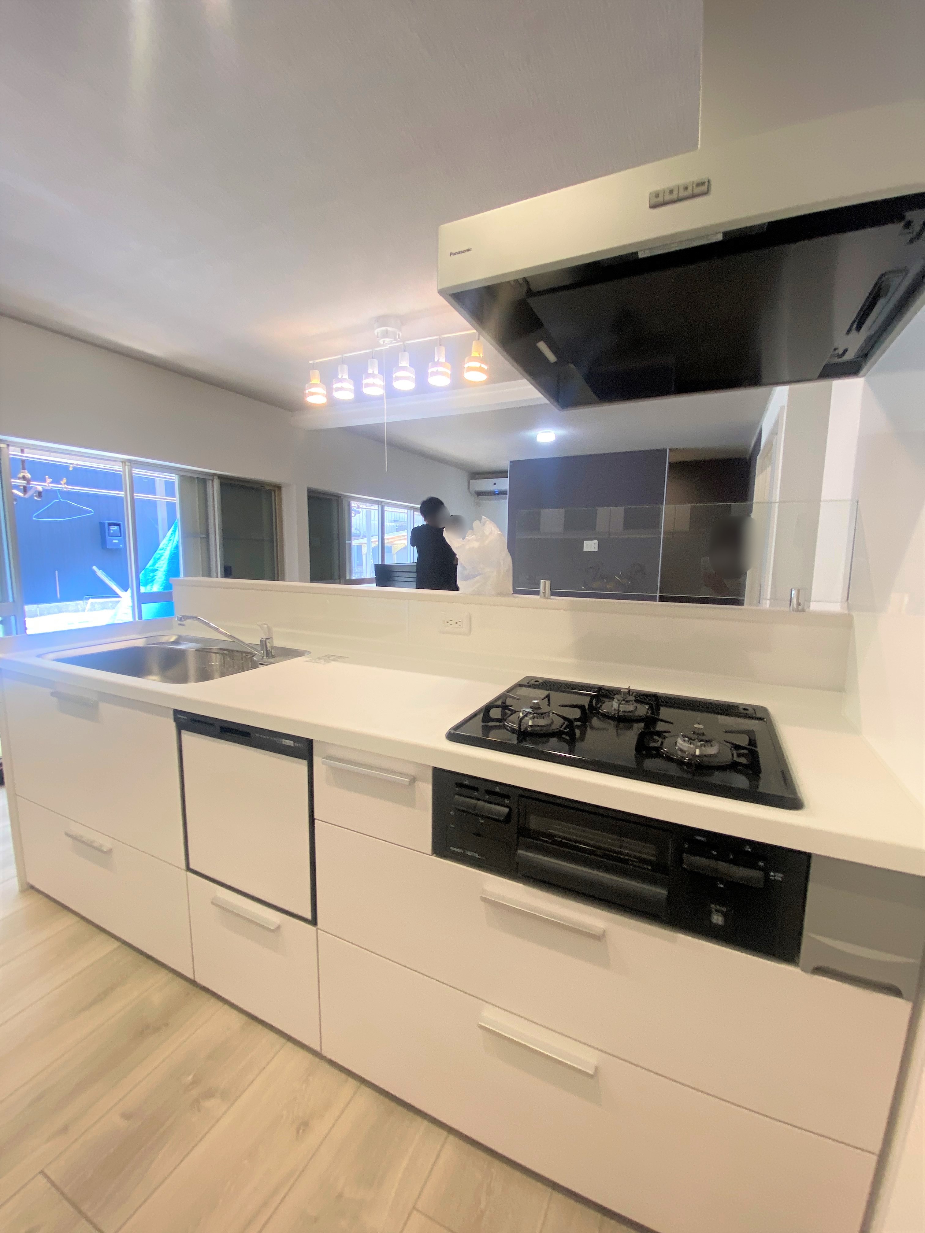 キッチン周りがスッキリするようカップボードを増設し、対面キッチンに変更。その他、照明やスイッチ・コンセントの場所にも気を配り、ご家族様で快適な暮らしができるよう全面改修しています。