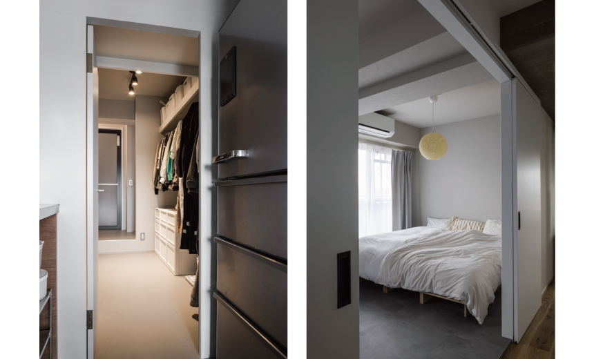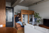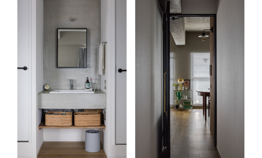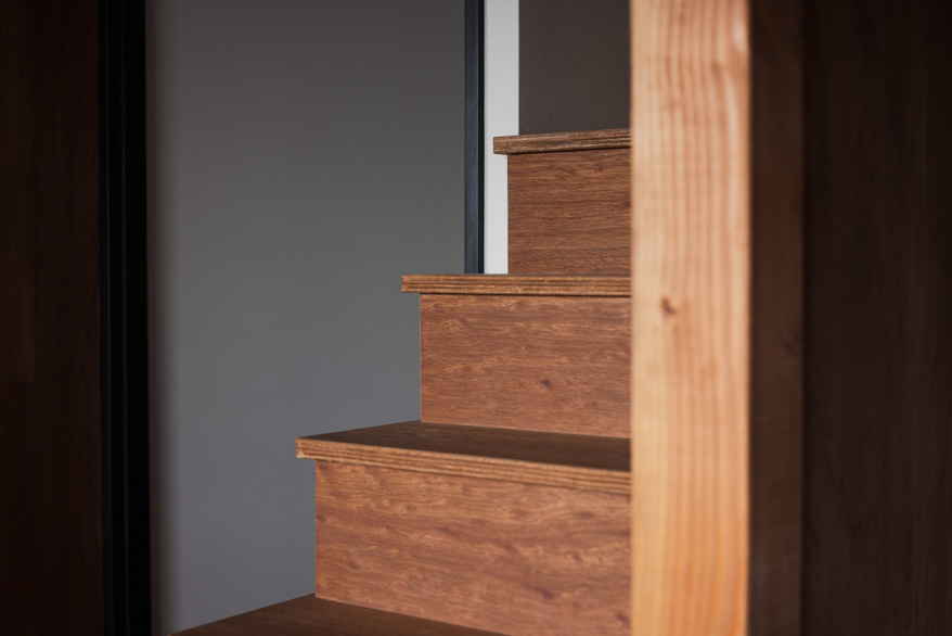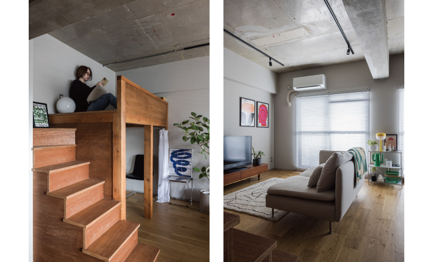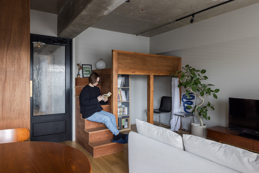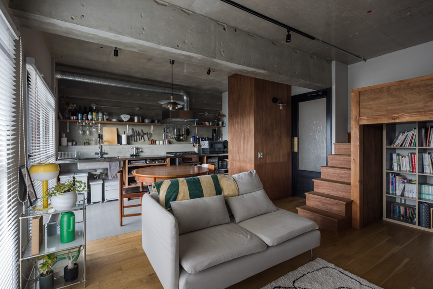 キッチンに立つご主人さま。ロフトで本を読む奥さま。そんな姿が思い浮かぶ、それぞれに定番の位置がある住まいができました。 職業柄、キッチンへの思い入れがあるご主人さまが選んだのは、厨房を思わせる少し無骨な壁付造作キッチン。オープン棚は物の出し入れがしやすく、何があるか一目瞭然。正面の壁にキッチンツールがズラリと並ぶその様は、活動的な雰囲気です。 リビングにあるロフトは奥さまのくつろぎスペース。ソファ以外にも落ち着ける場所が増えました。 ロフトの上では読書に没頭したり、階段に腰掛けながらおしゃべりをしたり、ロフトの下ではカーテンを閉めて、秘密基地のような空間を楽しめたりと、気分や用途に合わせた柔軟な使い方ができます。 それぞれの居場所で好きなことをしていてもお互いの様子がわかり、声が届く距離感も居心地が良い秘訣。自分の時間も満喫できる、バランス良い暮らしが実現しました。