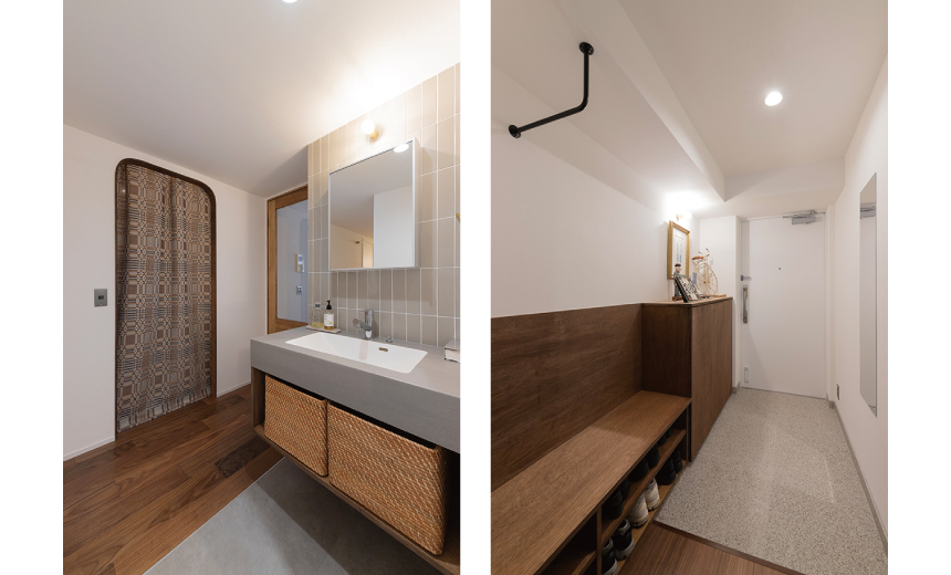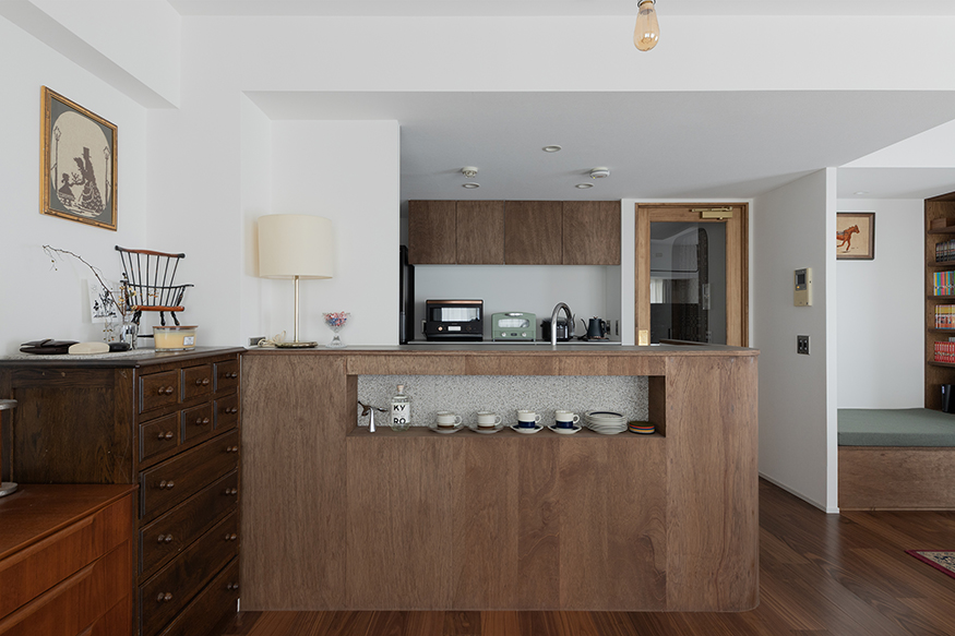 「家族や友達が集まる家」をテーマに、リビングにはダイニングテーブルやソファの居場所の他に、おこもりヌックや窓辺に配置した造作ベンチを作りました。 ベンチは座面と同じラワン材の背もたれを組み合わせることで、家具のような雰囲気に。 実際に20人程のゲストを迎えた際も「皆が座ってくつろげた」と話す施主様。 さらに、ゲストも気軽に使いやすい廊下に面したオープンな洗面台や玄関のベンチなど、おもてなしのアイデアが随所に取り入れられています。 元からお持ちだったアンティークの家具やラグ、小物もすべて居場所を決め、新しく迎えた家具も合流。 家族や友人が集まるシーンもあれば、自分たちの好きなものに囲まれて、それを眺めながら、ごろごろしながら、たまには籠りながら、様々な楽しみ方ができるおうちになりました。