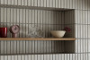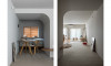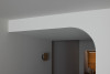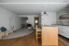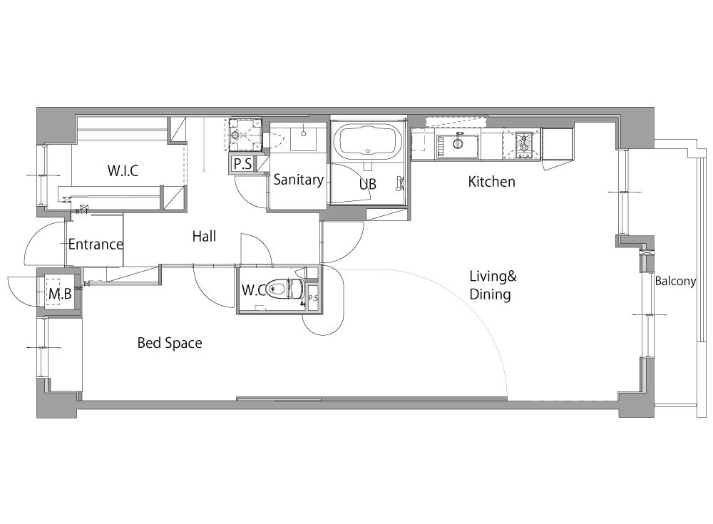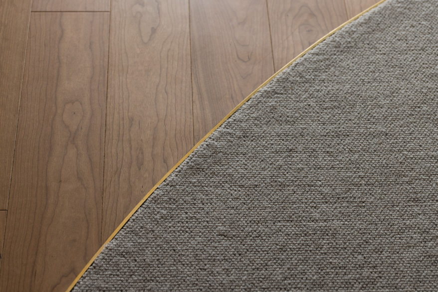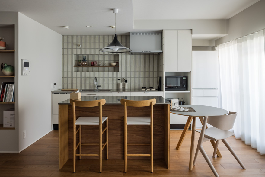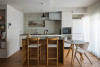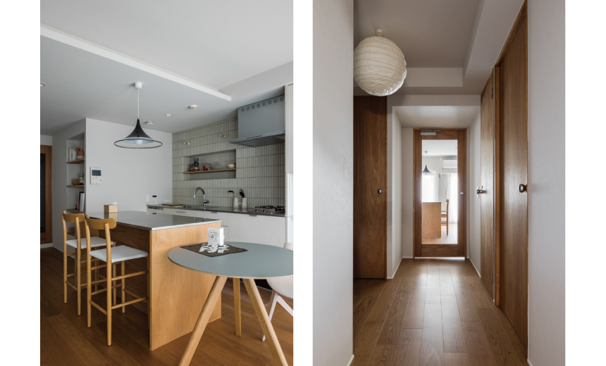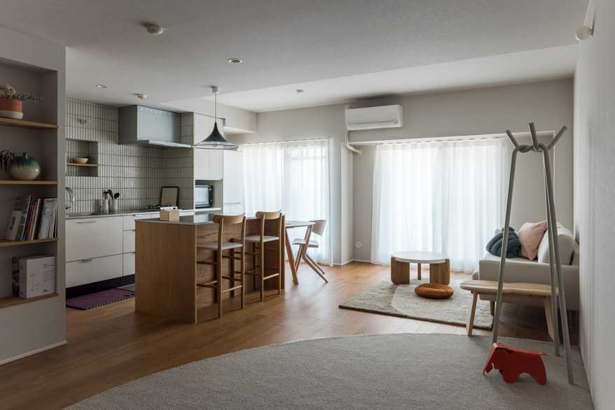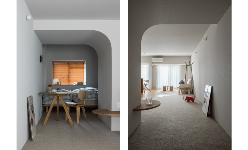 カーペットの上でゴロゴロしていても、キッチンで料理をしていても、ベッドで静かに休んでいても。 それぞれが思い思いに過ごしながら、同じ空間を共有している安心感を大切にした住まいです。 ひと続きのワンルームのような開放感を持ちながら、少し閉じたようなプライベート感も大切にした間取りが特徴。天井や床、カウンターに取り入れたアールが、壁の代わりとなってやわらかに空間を整えます。 各スペースは用途を限定せず、テーブルセットはベッドスペースのそばに置いたり、来客時にはキッチンへ移動して会話を楽しむ場にしたりと自在にアレンジ可能。 日常にもゲストシーンにも柔軟に対応できるレイアウトです。 インテリアは、ブラックチェリーのフローリングとグレージュのカーペットを基調に、廊下にはラワンのオリジナルドアを。 落ち着いた色調の中に、お手持ちの家具や小物が自然と馴染み、施主様の雰囲気を映し出すような色合いに。 同じ空間にいる安心感と、自分のペースも大切にする、そのバランスが暮らしの豊かさにつながります。