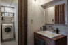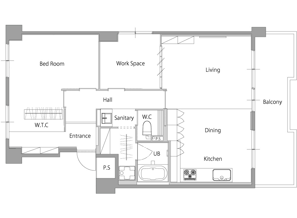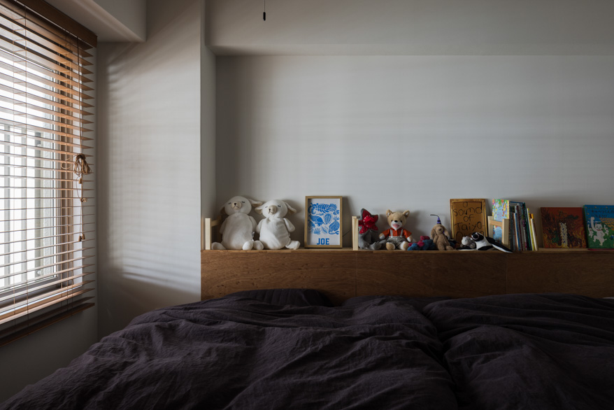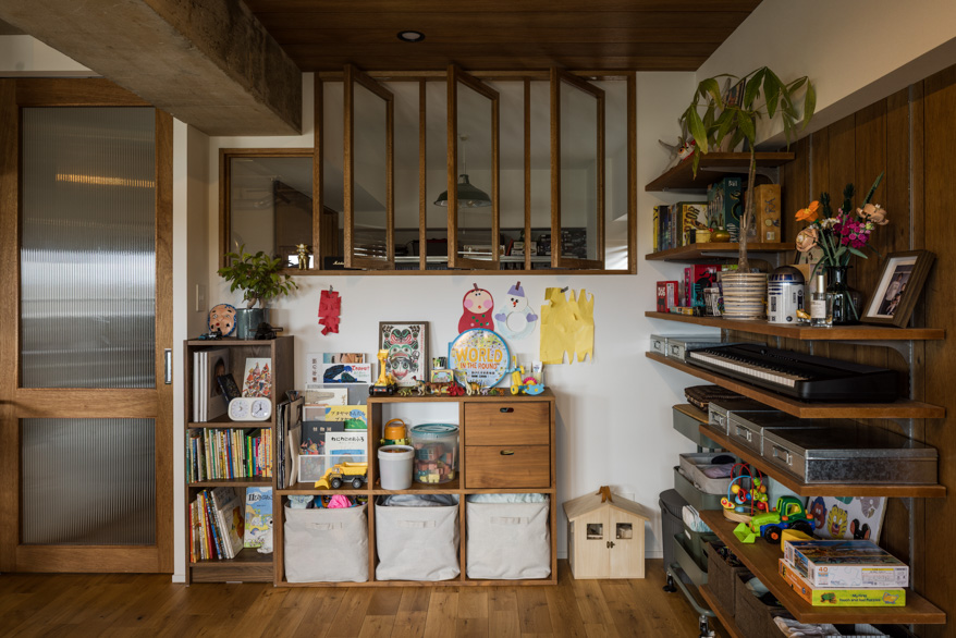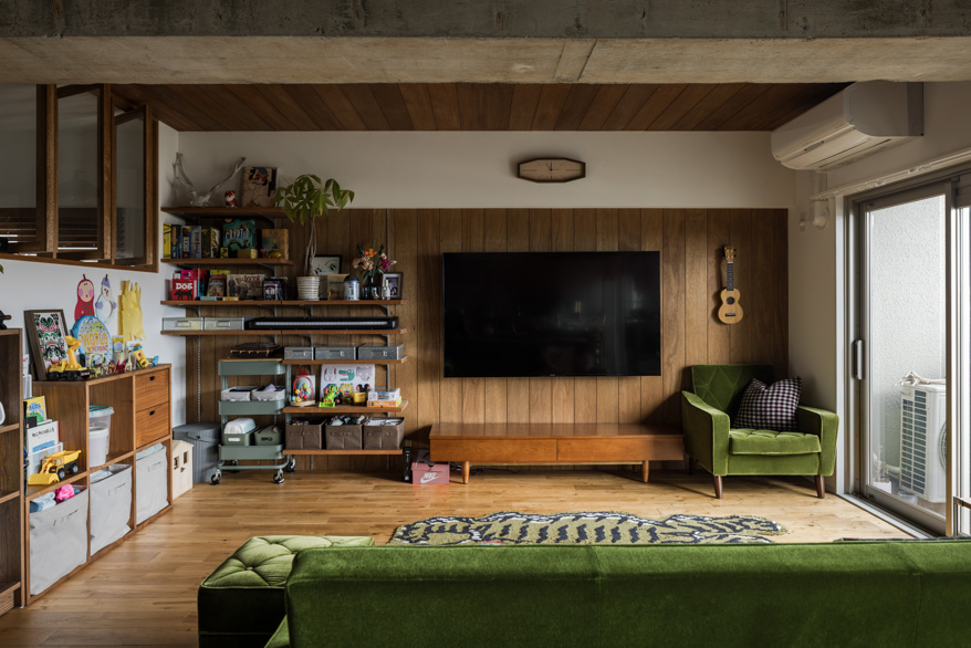 異なるふたつの表情をもつLDK。 リビングには壁と天井にラワン材を用い、木の質感が空間にあたたかみをもたらします。 対照的に、ダイニングキッチンは打ちっぱなしのコンクリート天井にグレーの床、ステンレスキッチンが並ぶ、素材の硬質さを活かしたクールな印象に。 床にゆるやかな段差を設けることで、視覚的にも空間が切り替わり、用途ごとのゾーニングが明確になりました。 また、床上げすることで「ダイニングからTVを見やすい」「ソファの位置が自然と決まって、暮らしやすい」といった嬉しい気付きもありました。 空間全体はどこか懐かしさを感じる素材と色味をベースに、レトロな雰囲気の家具や小物がアクセントとなる構成に仕上がりました。