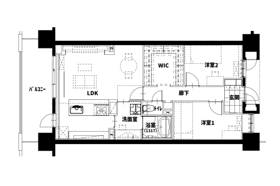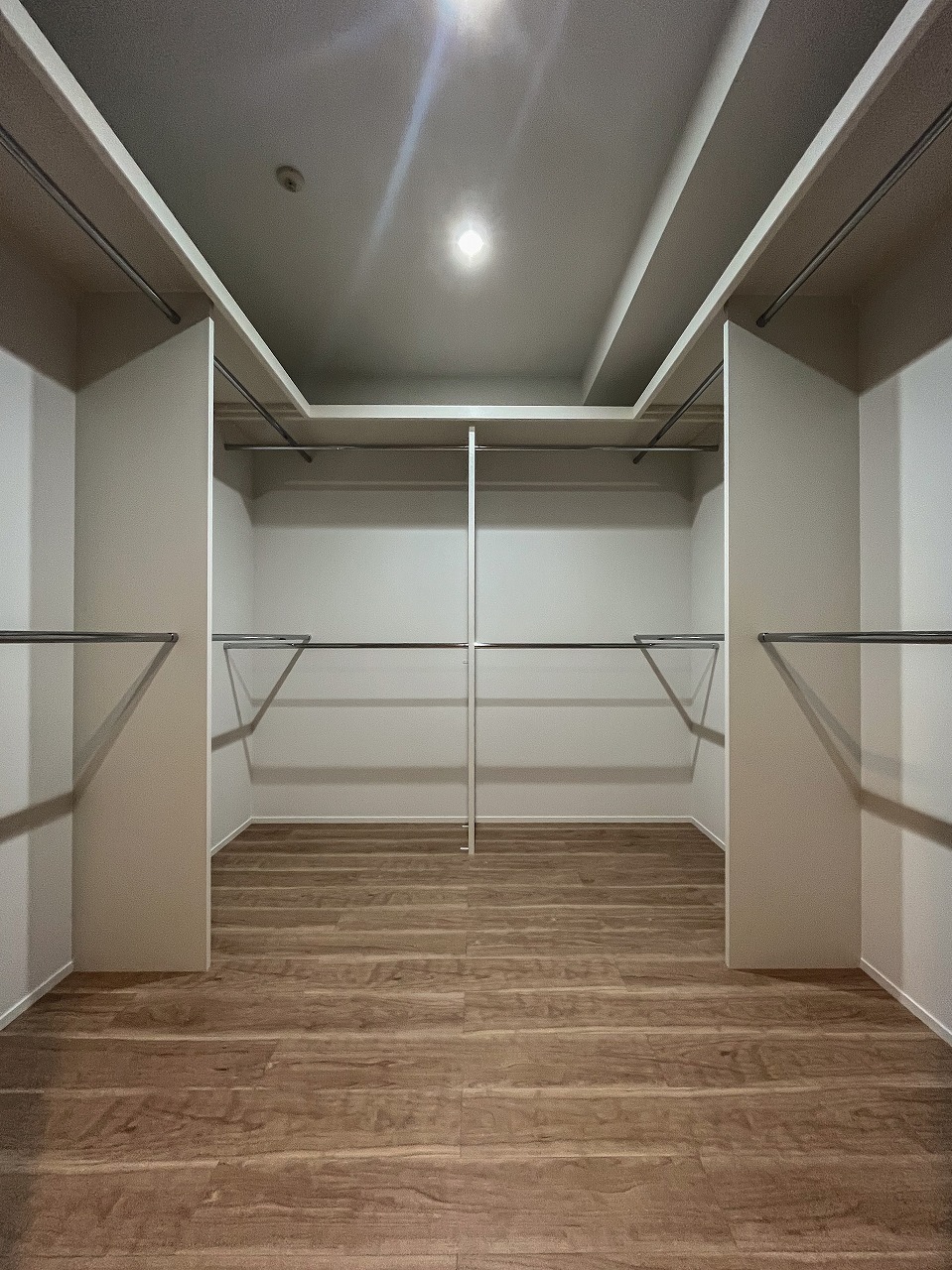 個室を少しずつ縮小し、水廻りや滞在時間の長いLDK空間にスペースを多く確保する計画としています。併せて1部屋はウォークインクローゼットに作り替えることで、雑多な印象になりがちな洋服や小物をまとめて収納できるように配慮しました。