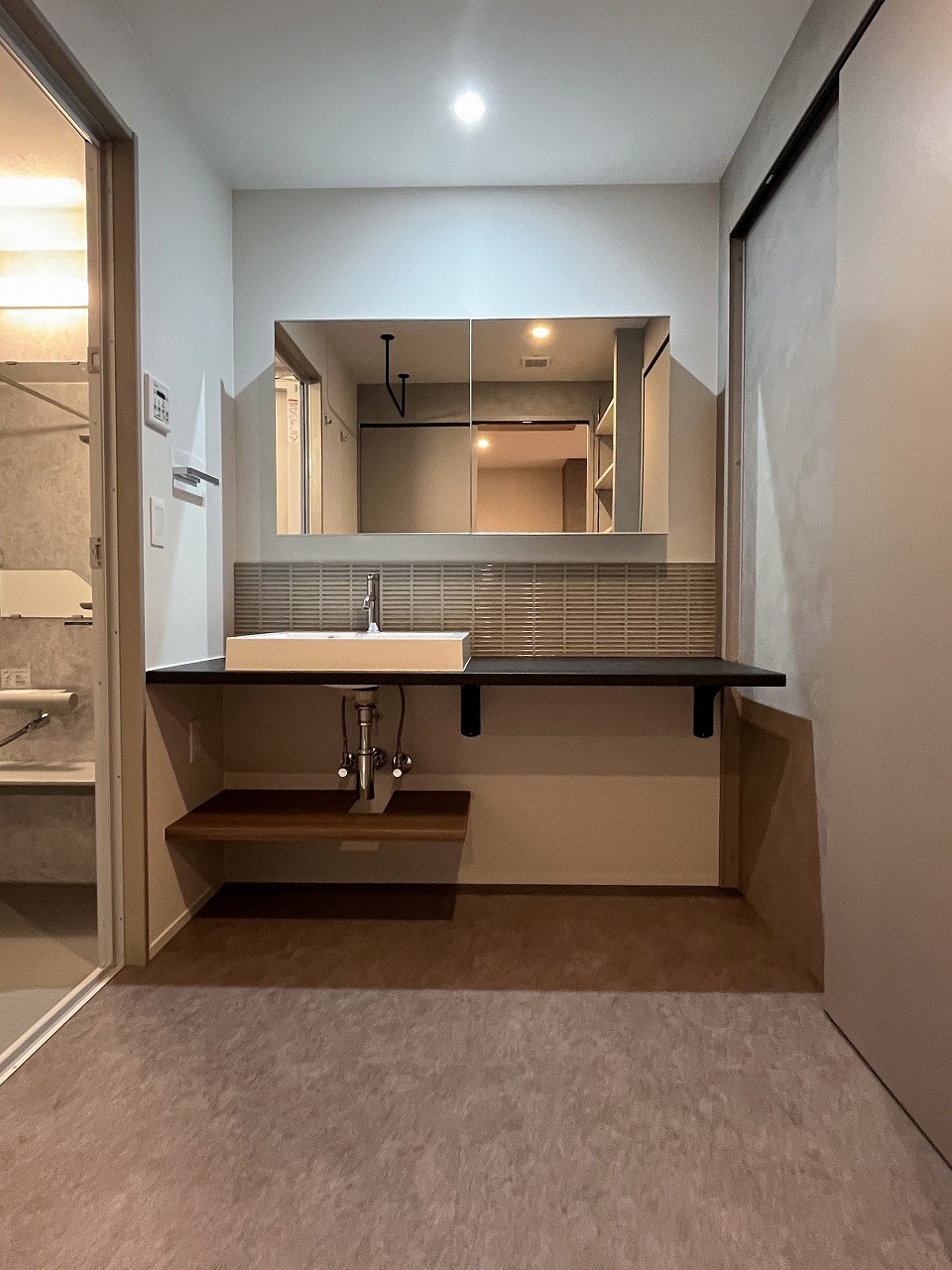 洗面室は日常的にも使いやすい回遊動線を確保しつつ、LDKと共通するイメージとすることで、一体感を感じられる空間として提案しました。