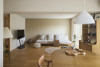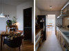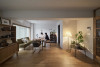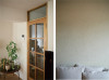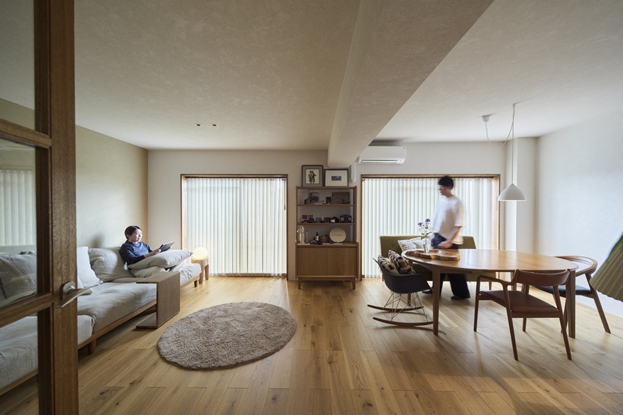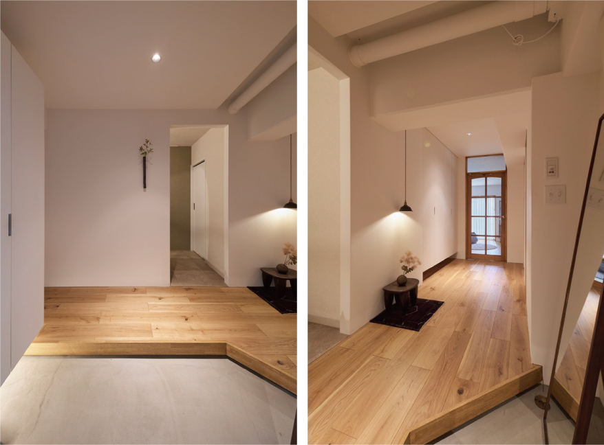 S様がこの物件に決められたもう1つの理由は、玄関を入ると空間が左右に分かれていること。玄関から右に向かうLDKは活動の間、左に向かう寝室は静寂の間と、用途をきれいに分けたかったのです。玄関ホールと廊下はたっぷりと空間を設け、灯りを楽しむ間に。目線より低い位置まで垂らしたペンダントライトが、光と陰影を生み出します。家具やインテリアを際立たせるために、空間はすっきりとシンプルに。構成要素の多いキッチンは独立型にして、ダイニング、リビングからは見えにくいように。キッチンと、LDKに続く建具は既存のものを移設し再利用しました。ベランダ側の壁はふかして、梁を隠し、凹凸のないすっきりとした壁面を作ります。リビングの壁一面はアクセントカラーの珪藻土仕上げ。コテの後を立体的に残し、趣きを醸し出します。複数の間接照明が落とす光と影、それに彩られるインテリアが存分に映える空間です。座りたい場所に座って、朝はベランダの季節の移ろいを眺めて、夜は複数の灯りにくつろいで。ダイニング側から、ソファ側から空間を楽しみます。空間の余白はあえて多めに、「余白を使えることが心の余裕につながります」と奥さま。「賃貸の頃は、灯りが白くて落ち着かなったのですが、今は電球色で落ち着きますね」と旦那さま、やわらかな光を灯す空間は、おふたりの心も照らしているようです。